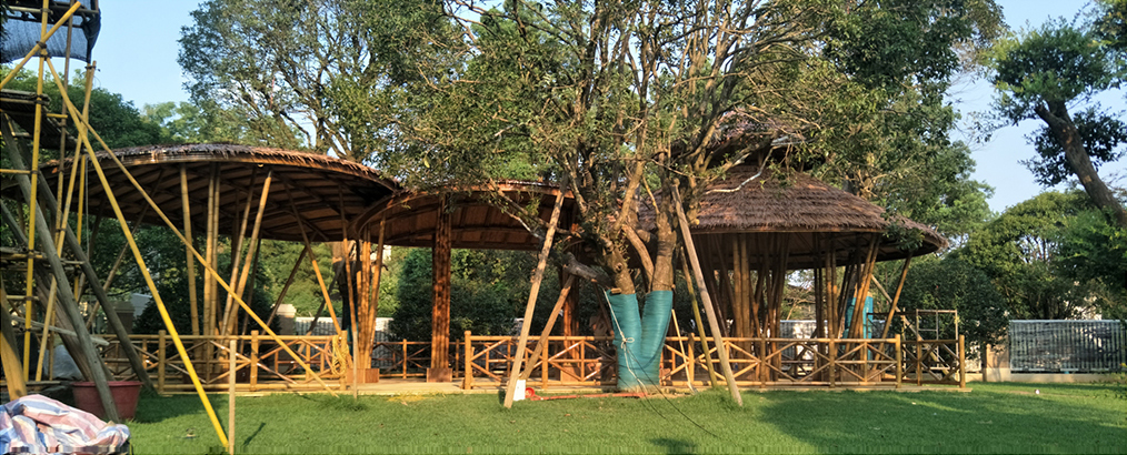 工程敘述:異形竹鋼建筑、竹編建筑、竹藝裝飾墻、竹編建筑
